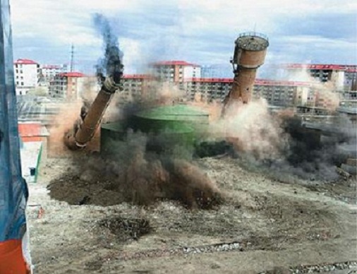 15時整,隨著幾聲巨響,北側(cè)建于1990年的煙囪首先被起爆,這根煙囪由于距離居民區(qū)太近,因此,爆破點位于煙囪根部約20米。隨后,建于1993年的第二根煙囪從根部爆破。兩根100米高的煙囪在十幾秒內(nèi)轟然倒下,蕩起滾滾灰塵。