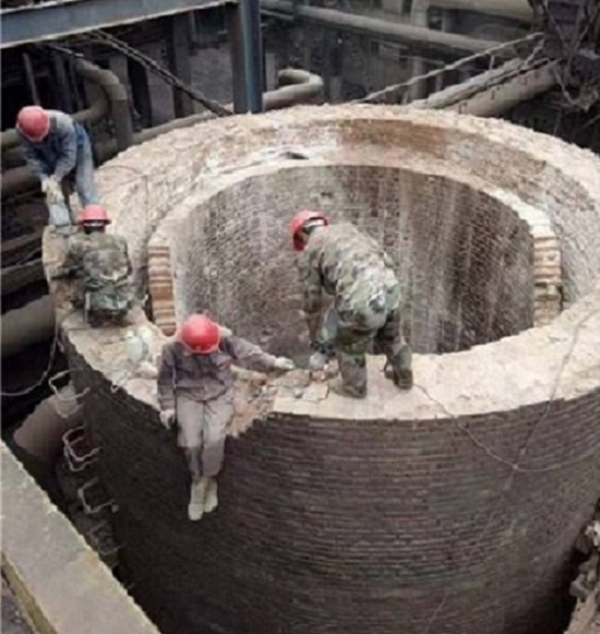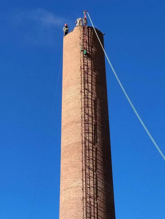 在煙囪頂口上橫放一塊木板、兩頭伸出煙囪各30公分以上,由于煙囪頂口和底部有誤差所有要以將誤差計(jì)算在內(nèi)。施工人員帶好保險(xiǎn)帶、站在木板與煙囪墻壁上進(jìn)行施工,用電鎬手錘進(jìn)行拆除,拆除下來舊磚由煙囪外面掉下來,或者走煙道內(nèi)部清理。